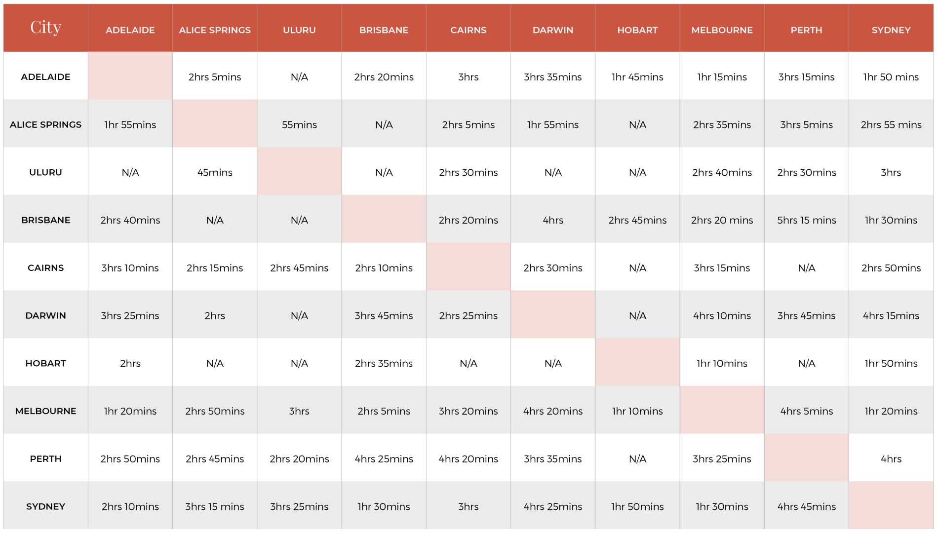 Many visitors are unaware of the size of Australia, and the flight times involved when travelling throughout the country. When time is limited, we recommend that your clients fly between major cities. The following chart provides an estimate of flight times between key cities.